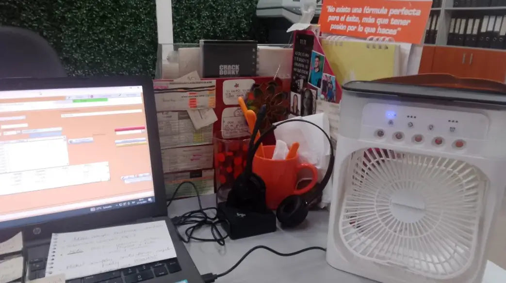 Es un enfriador de aire personal que combina ventilación, humedad y aire frío para reducir la sensación de calor en tu espacio cercano.